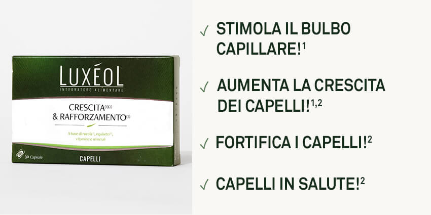 Luxéol Crescita1,2 & Rafforzameto2 supportandone la crescita e il rafforzamento dei capelli grazie alla equiseto e contribuisce alla normale crescita dei capelli grazie alla rucola.